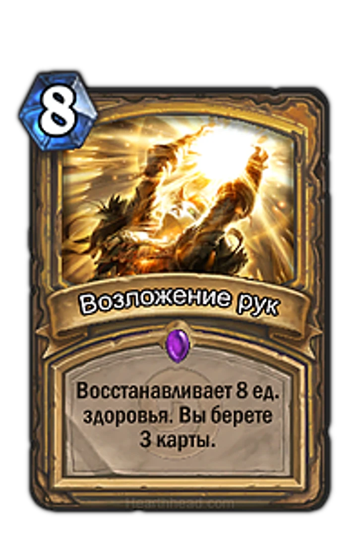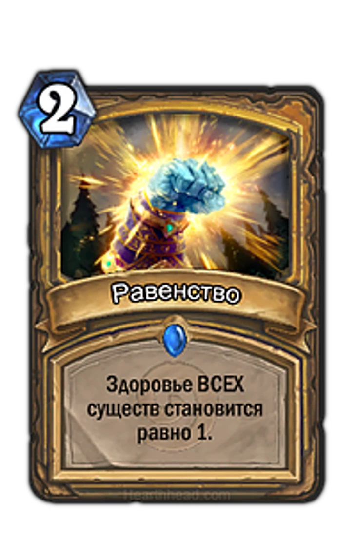 контроль игры с помощью существ. Паладину предоставлены все условия для того, чтобы он постоянно удерживал стол под своим контролем — способность героя, оружие, карты, плодящие больше одного существа, а также отличные заклинания. Паладин, возможно, единственный класс, все типы колод которого зависимы от контроля стола, ведь даже у шамана есть комбо-колода на Малигосе. Из этой особенности проистекает и другой интересный момент, который уравновешивает его достоинства — паладин не может резко убрать вам много здоровья, если у него нет существ на столе.