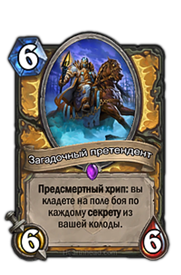 План победы — выкидываем на стол существ, ставим «Загадочного претендента» и выигрываем партию. Серьезно вам говорю — это один из простейших типов колод, которые я когда-либо видел — главное заиметь «Загадочного претендента» к шестому ходу, стараясь до этого выкладывать карты из руки по мана-кривой. Простая — не значит самая сильная, и не значит, что против неё невозможно играть, простая — значит то, что колода позволяет делать много ошибок, мелких и не очень, и всё равно стабильно ползти вверх по ладдеру. Изначально, как вышел «Большой турнир», была популярна эдакая вариация эболадина, только с секретами, сейчас же намного чаще можно встретить мидрейнж вариацию — с «Тирионом», «Доктором Бумом», «Изрыгателями слизи». Главная сила и главная слабость колоды — тот самый мужик на коне. Сила — потому что он делает ход стоимостью примерно в 15-20 маны, только паладин платит за это 6. Слабость — потому что если эта карта не придёт вовремя, паладину очень тяжело победить.