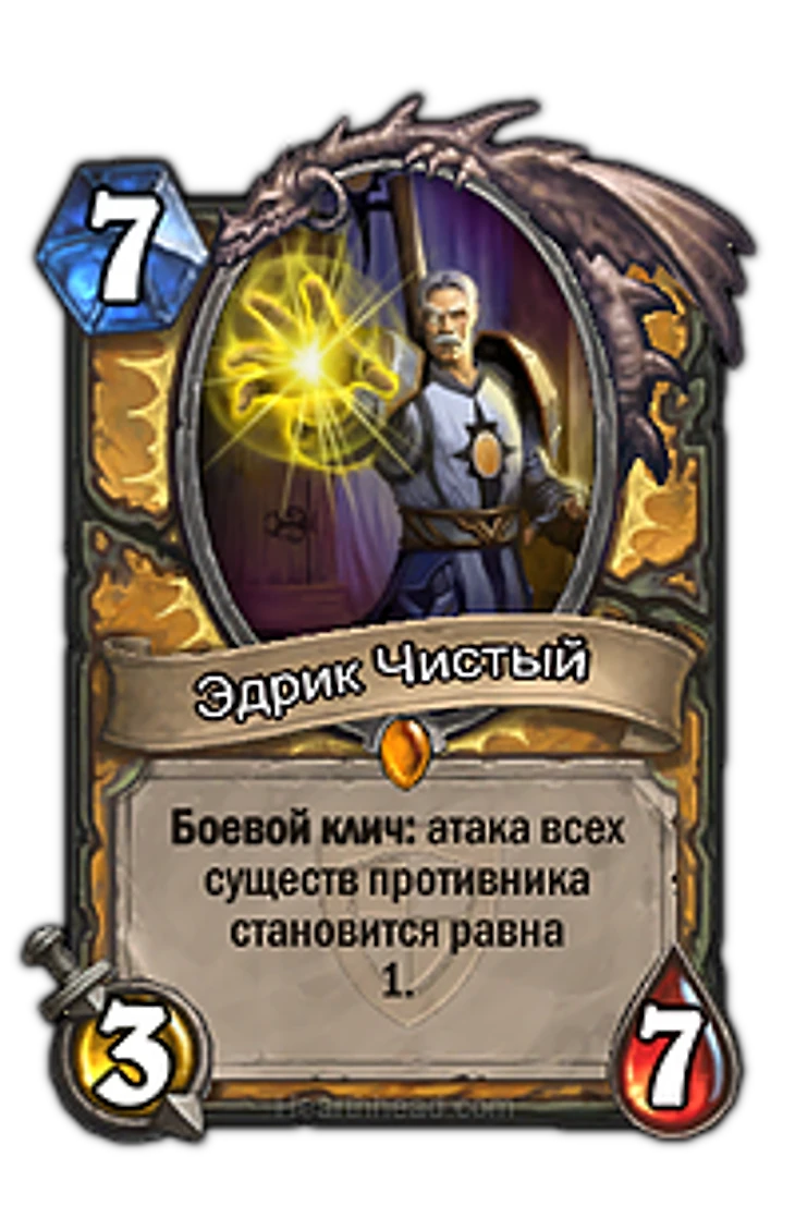План победы — самый непростой вопрос касательно паладинов заключается в том, что сложно понять, где кончается мидрейнж и начинается контроль. Лично моё мнение, что ключевой момент — это смена «Жонглёров» на «Яростных пиромантов» и добавление в колоду большего количества лечения и дебафающих карт, например, «Эдрика Чистого». Такой паладин легче переживает потерю стола в начальной стадии игры благодаря комбинации «пиромант» плюс «равенство» и большому количеству лечения. До появления «Защитных миниботов» и «Призыва в бой» (считай, до появления нормальной стартовой игры) паладины играли практически только такими сборками. Сейчас же очевидно, что выбрать контрольную версию стоит только, если вы хотите более напряжённых игр. Это сильная колода, но она уступает своему мидрейнжевому собрату, потому что механика Hearthstone устроена так, что более агрессивная игра поощряется больше выжидательно-контрольной.