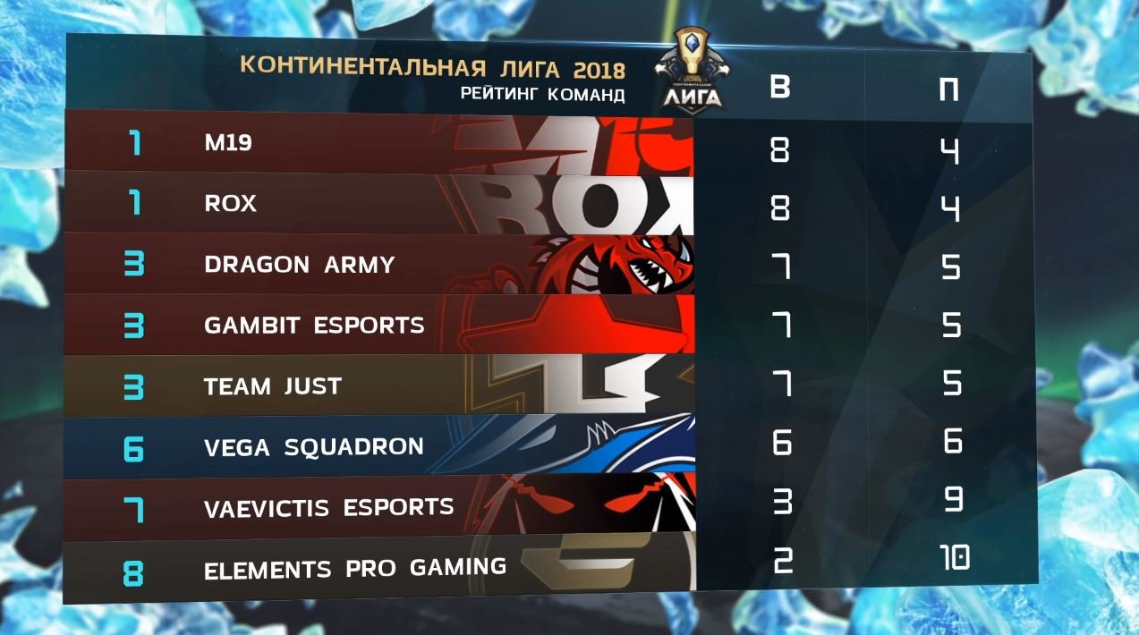1-2. M19 (8-4)1-2. Rox (8-4)3-5. Gambit Esports (7-5)3-5. Team Just (7-5)3-5. Dragon Army (7-5)6. Vega Squadron (6-6)7. Vaevictis Esports (3-9)8. Elements Pro Gaming (2-10)