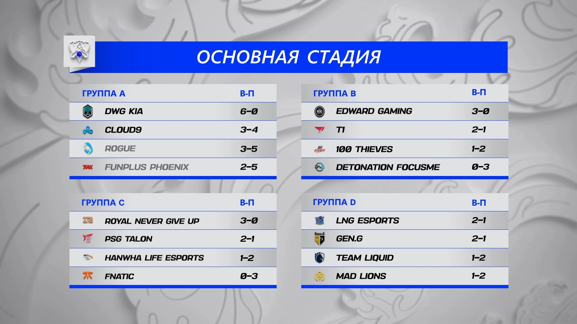Из группы А в финальную стадию турнира прошли Damwon (Южная Корея) и Cloud9 (Северная Корея), которая обыграла FPX (Китай) и Rogue (Европа) в переигровках за второе место.