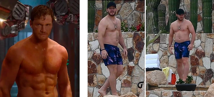 Крис Пратт за 6 месяцев сбросил 27 кг для роли Звездного Лорда. Но фанатки были в восторге не от этой трансформации – а от возвращения небольшого животика спустя время после съемок.