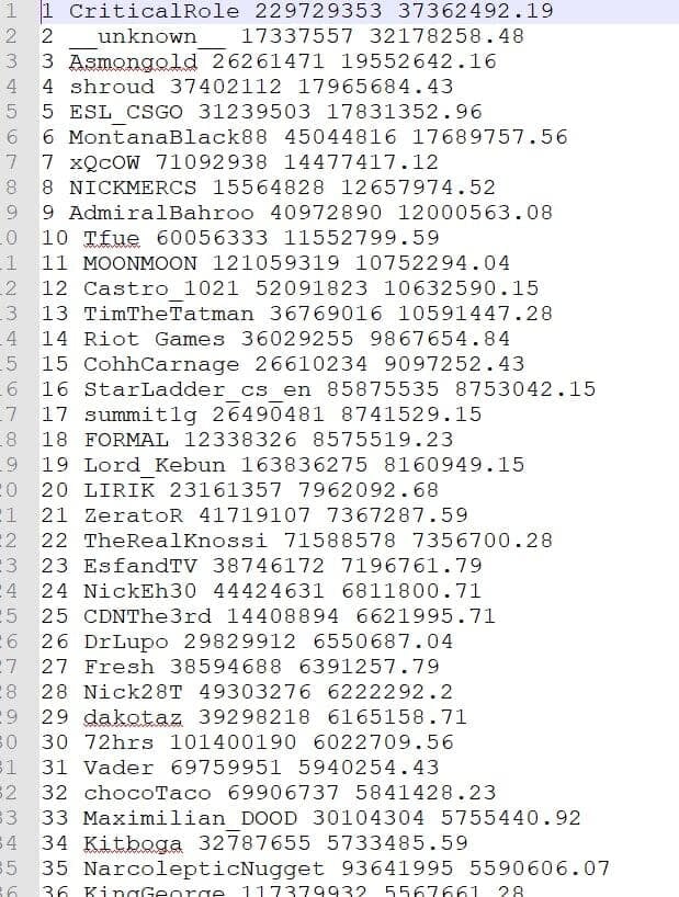 Доход топ-стримеров Twitch (в третьей колонке) за 2019 год из утечки