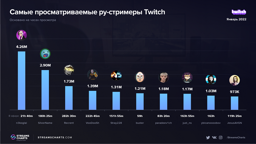Сайт Stream Charts подвел итоги по просмотрам русскоязычных стримеров за январь. Ежемесячный топ возглавил стример Некоглай – его трансляции набрали 4,26 млн часов просмотра при 22 часах в эфире за месяц.