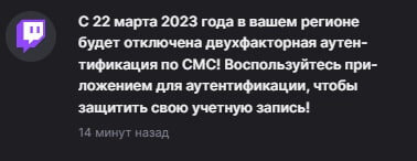 Пользователям пришло уведомление о том, что функция будет отключена 22 марта 2023 года. Twitch посоветовал защищать свой аккаунт через приложение для аутентификации.