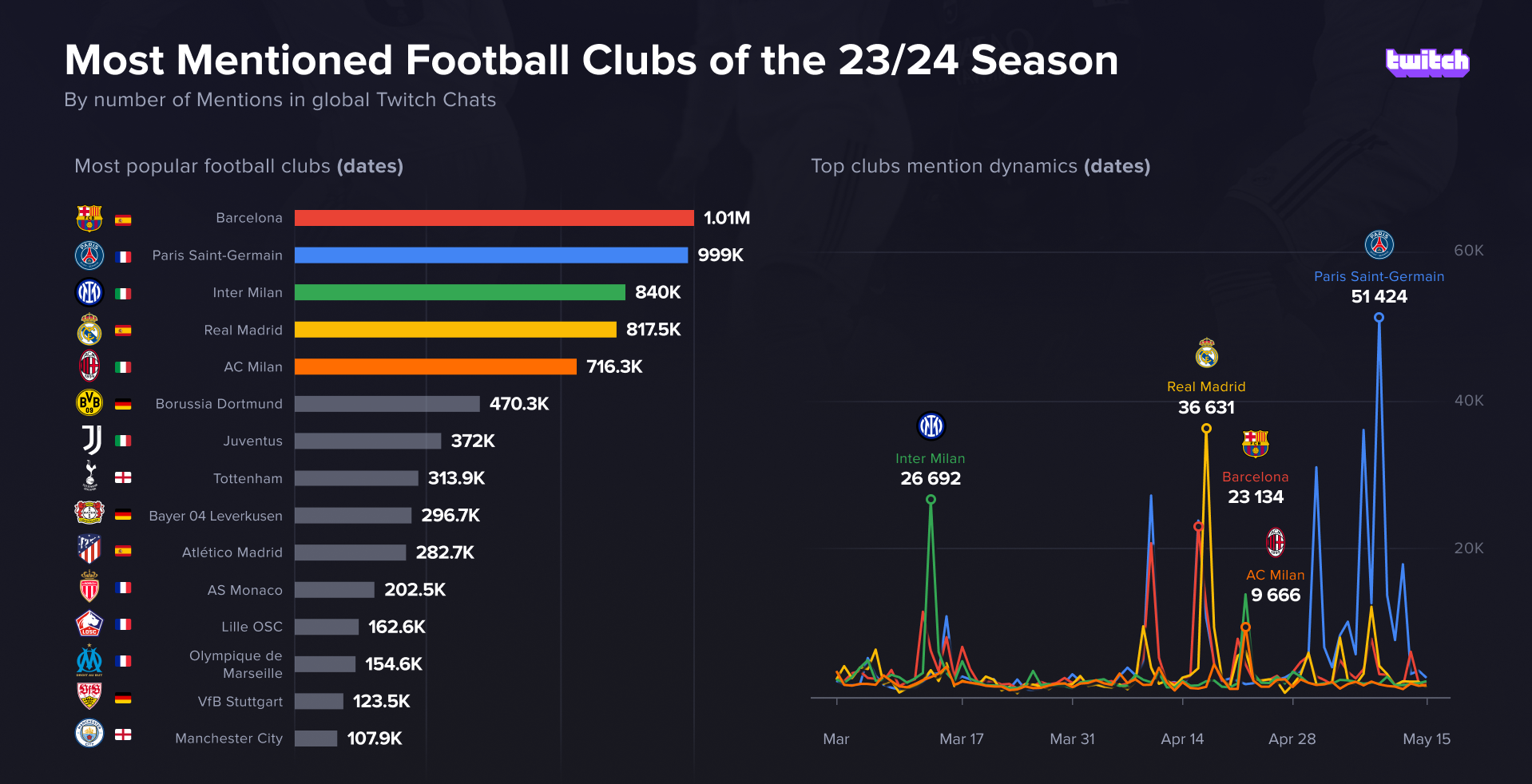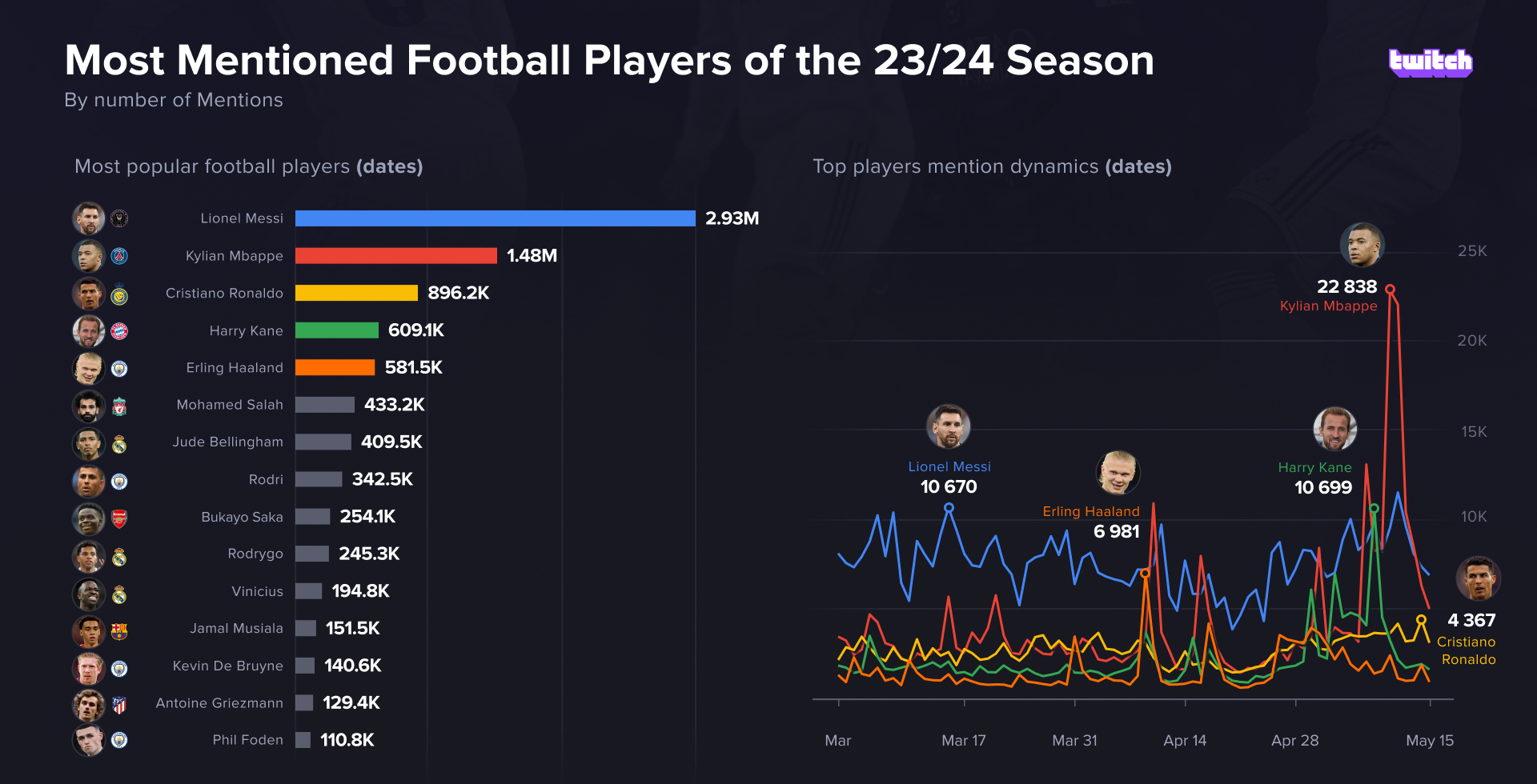 У Лионеля Месси в чате Твича более 2,93 млн упоминаний за год. Он обходит Килиана Мбаппа на 1,45 млн сообщений.