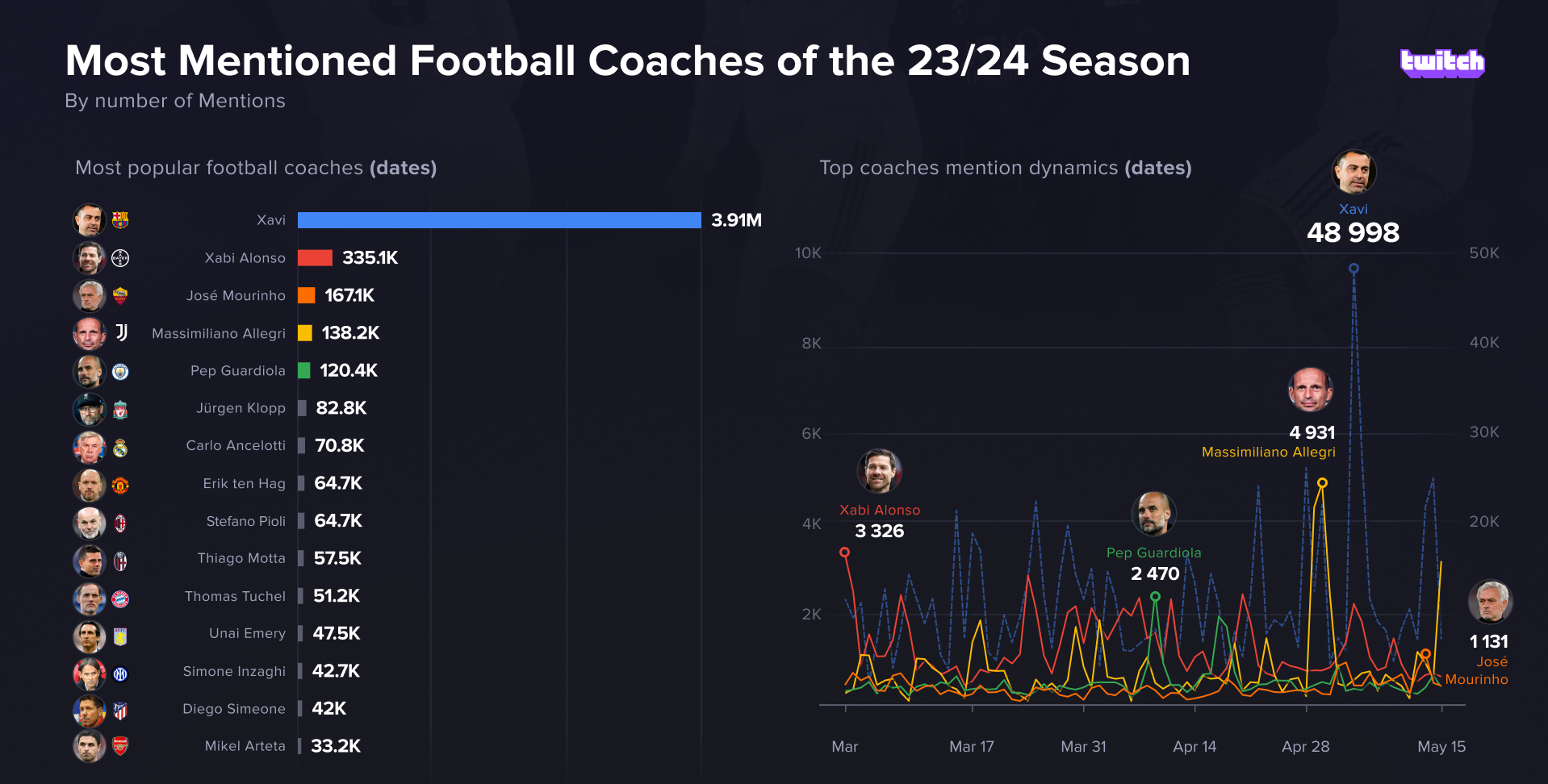 Среди тренеров лидирует Хави («Барселона») – 3,91 млн упоминаний.