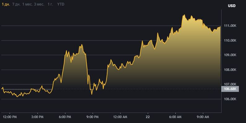 Биткоин преодолел отметку в 111 тысяч долларов