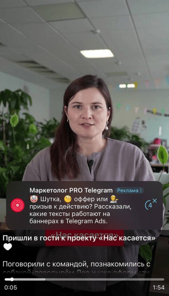 Мессенджер Telegram представил рекламные баннеры, которые появляются у пользователей при просмотре видео. Баннеры размещаются через рекламную платформу Telegram Ads.
