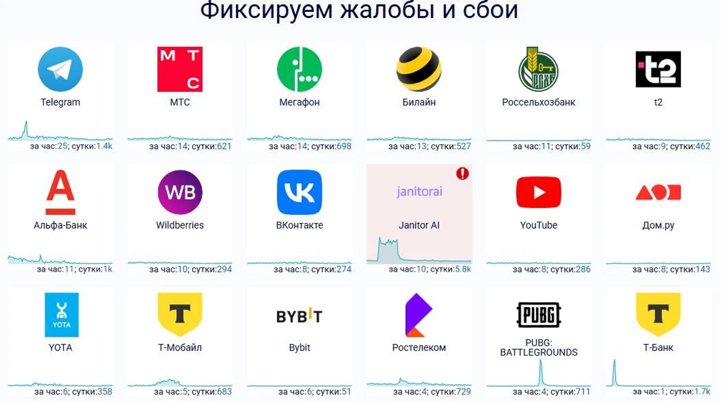 Среди сервисов и приложений утром, 14 сентября, массовые сбои наблюдаются в работе Telegram и Janitor AI.