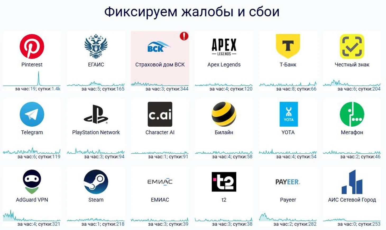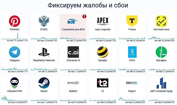 Среди сервисов и приложений утром, 14 ноября, массовые сбои наблюдаются в работе Pinterest и ЕГАИС.