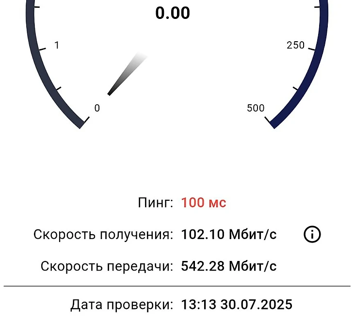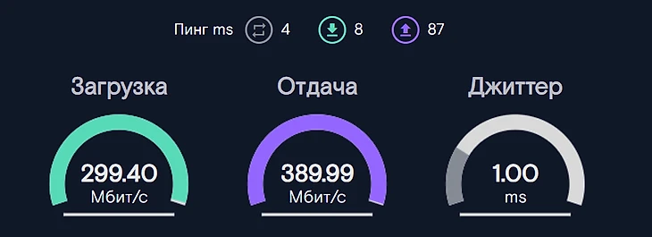 Скорость скачивания явно не дотягивает до реальных значений, загрузка в сеть же вполне удовлетворительная. А пинг для местного тестирования также мог бы быть лучше. Повторные проверки показали схожие данные.