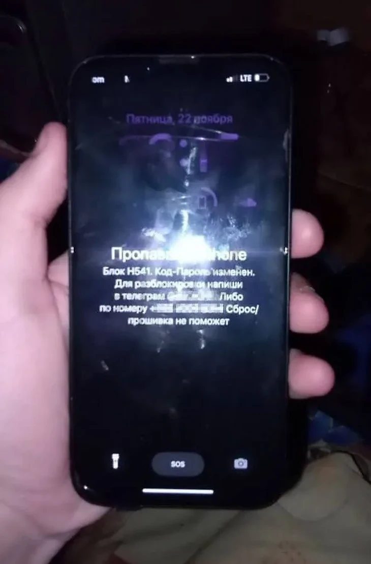 Затем злоумышленники меняют пароль, и пользователь не может выйти из чужого аккаунта. В результате гаджет блокируется. На экране появляется надпись, которая сообщает жертве: никакие его действия не помогут снять блокировку. Также указан контакт в Telegram для решения проблемы. Злоумышленники просто требуют выкуп доступа к смартфону за определенную сумму денег.