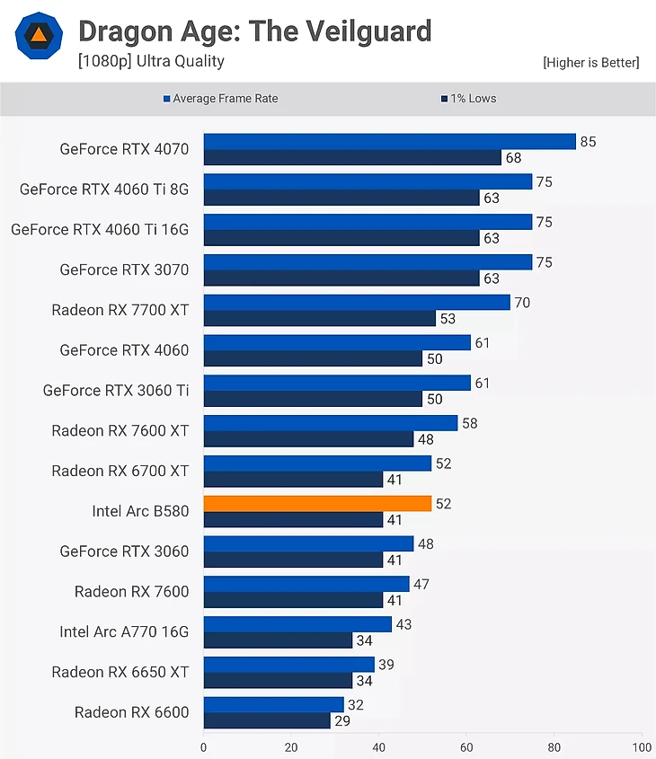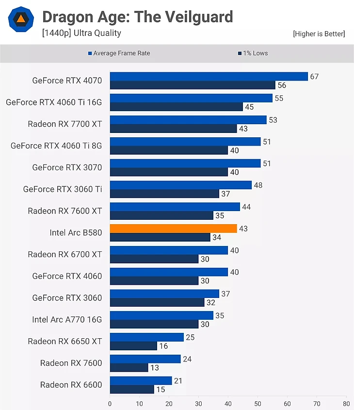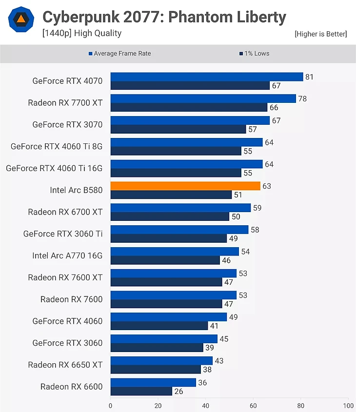 Эксперты из издания TechSpot проверили производительность видеокарты Arc B580 в 12 играх в разрешениях 1080p и 1440p на максимальных и «высоких» настройках графики.