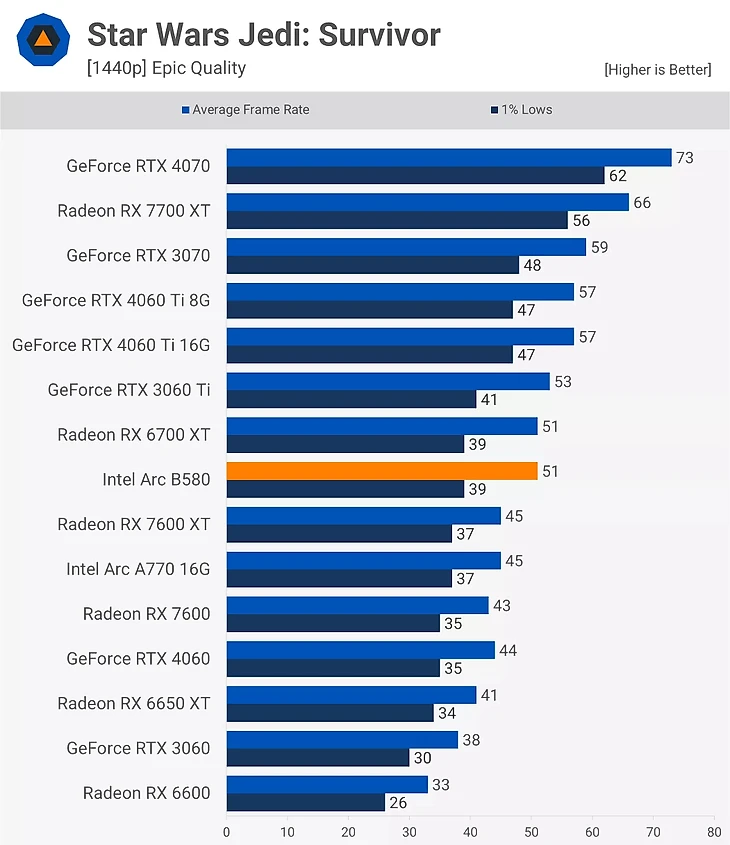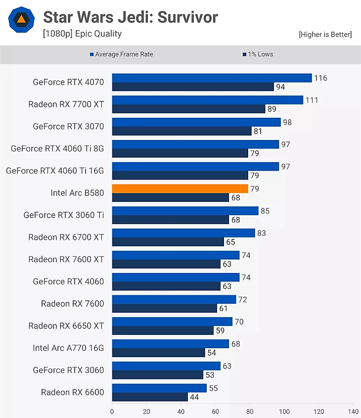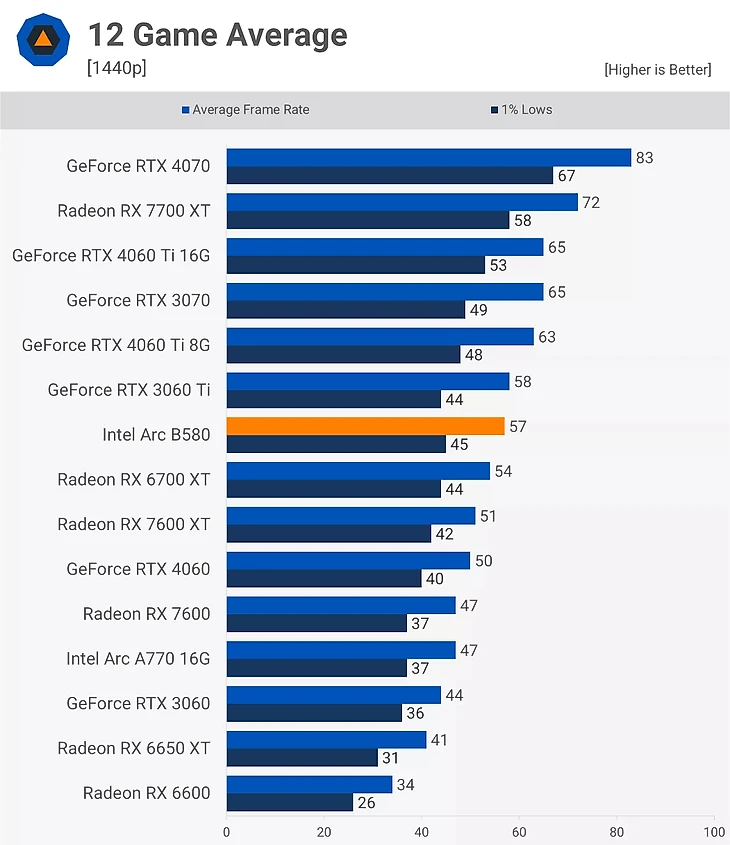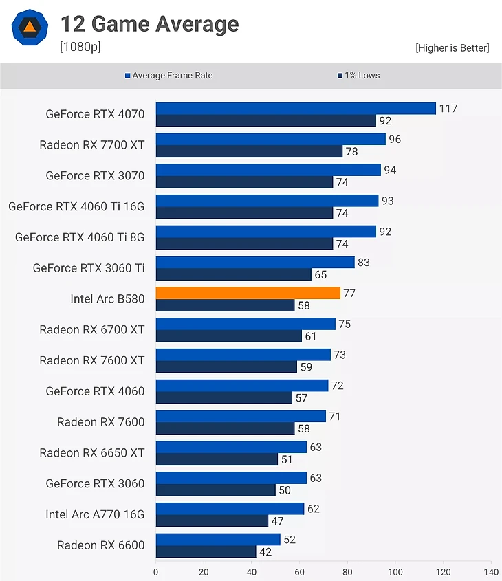 Предшественник из поколения Alchemist, Arc A580, уступил новичку на серьезные 42%. А вот поравняться с RTX 4060 Ti и RX 7700 XT свеженький Arc B580 уже не в состоянии. Однако и стоят они практически в 1,5 раза дороже.
