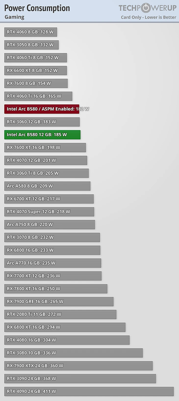 В играх B580 потребляет всего 185 Вт. Это гораздо лучше, чем A770 (235 Вт) из первой линейки, и даже энергоэффективнее RX 7600 XT (198 Вт). Но Nvidia и тут лидер – при нагрузке RTX 4060 потребляет лишь 128 Вт. Есть куда стремиться.
