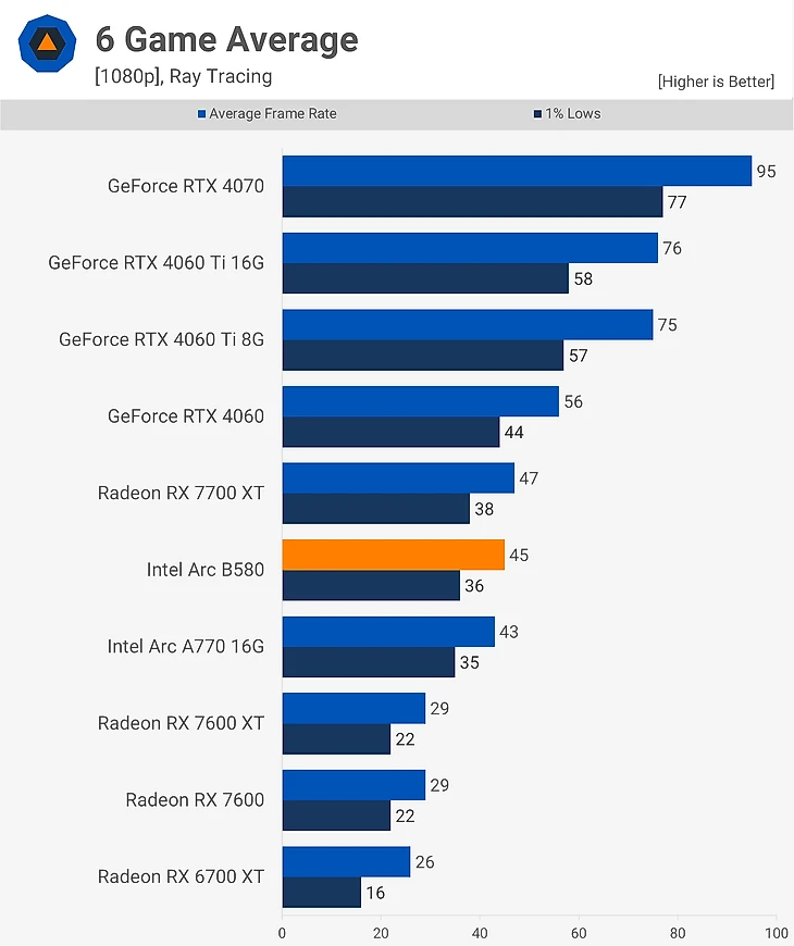 В новой графической архитектуре Xe2 Intel улучшила работу трассировки лучей. Но технологии Nvidia сложно превзойти. Тем не менее, несмотря на 20% отставания от RTX 4060, видеокарта Intel заметно превзошла конкурента AMD RX 7600 – на 55%.