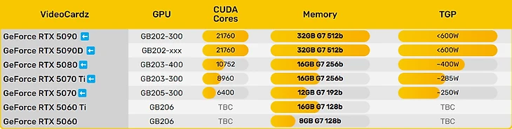GPU: GB202-300 Ядра CUDA: 21 760 Память: 32 Гб GDDR7 Шина: 512 бит Энергопотребление: ниже 600 Вт