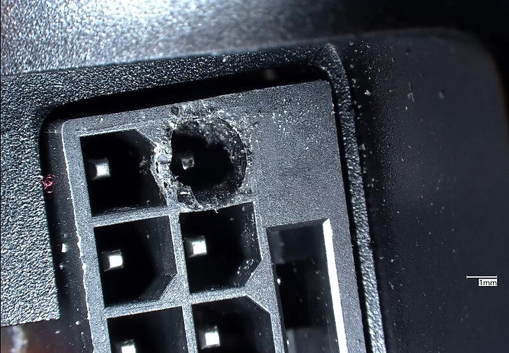 Хартунг сделал высококачественные микроскопические снимки обоих концов расплавленного кабеля, разъема GPU и разъема на блоке питания. Повреждения очень похожи на те, что были в случаях с RTX 4090 (у карточек была похожая проблема).