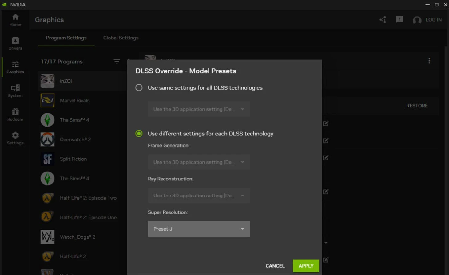 Внутри него выбираем параметр «Использовать разные параметры для каждой технологии DLSS», в поле Super Resolution выбираем Preset J (в русской версии «Предустановка К») или Preset K – обе модели являются DLSS 4.