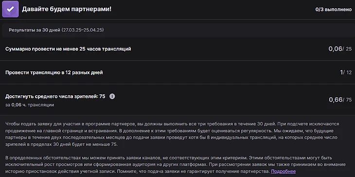 Соблюдение правил сообщества Twitch (отсутствие нарушений в течение 90 дней).