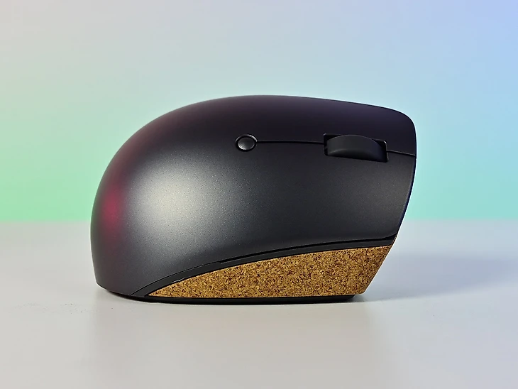 Мышь выделяется необычным дизайном: корпус из пробки с наклоном 45° создает комфортный хват. Модель компактная, подойдет для небольших ладоней, а ее форм-фактор напоминает обычную мышь, повернутую набок.