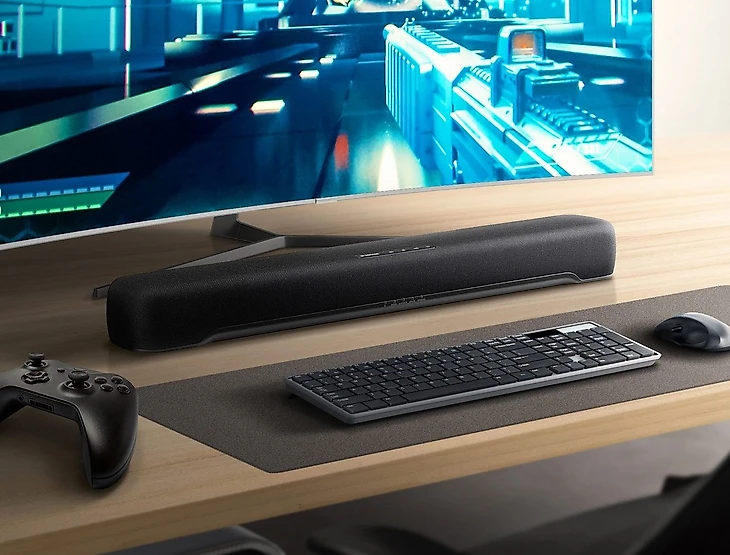 Саундбары – узкие панели с объемным звуком. Экономят место на столе.