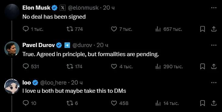 Спустя несколько часов Илон Маск отреагировал на анонс совершенно неожиданным образом. В комментариях под постом Дурова в соцсети X Маск сообщил, что никакой сделки не было. В ответ на сообщение Маска глава Telegram подтвердил, что соглашение между xAI и Telegram еще не подписано. По его словам, стороны уже договорились о сделке, но осталось завершить формальности.