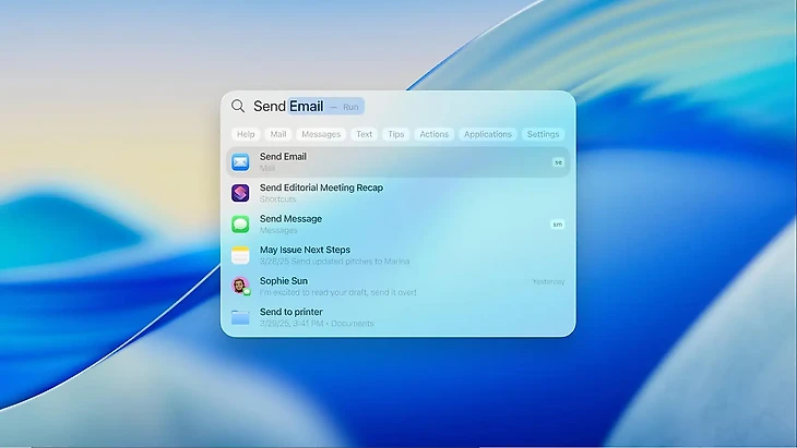Обновление Spotlight. Пожалуй, одно из самых крупных изменений в macOS 26. В Spotlight добавили новые фичи: поддержку коротких текстовых команд для запуска действий, умную сортировку результатов поиска, фильтрацию файлов, а также выполнение различных действий без необходимости покидать окно Spotlight.