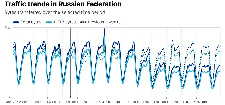 В Cloudflare Radar можно отследить июньское снижение трафика Cloudflare. В Роскомнадзоре же отрицают причастность к снижению трафика Cloudflare в июне, но допускают «проблемы у отдельных зарубежных хостинг-провайдеров».