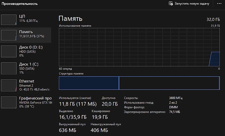 Откройте его и перейдете в раздел производительность, выберите пункт память. В пункте «Скорость» будет указана частота.