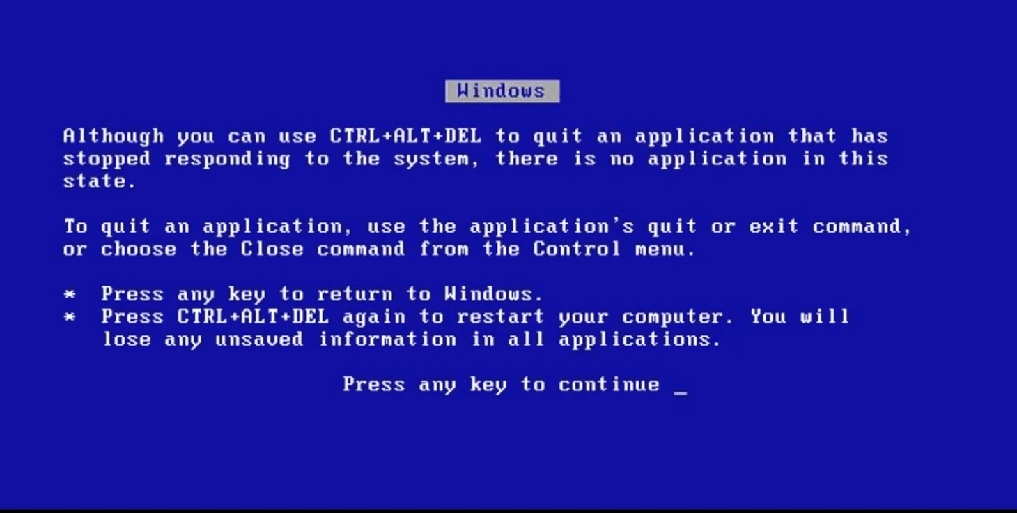 Впервые синий экран появился в Windows 3.1. Однако это был не BSOD с ошибкой, а всего лишь информационное окно, вызываемое знакомой комбинацией Ctrl+Alt+Delete. Если система падала, то экран был просто черным. А дальше перезагрузка.