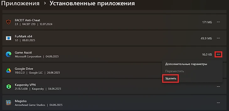 В списке найдите и удалите приложения: Copilot, Центр отзывов, Game Assist, Microsoft Bing, Microsoft Clipchamp, Microsoft To Do, Microsoft Teams, Power Automate, Quick Assist, Xbox Live. Для удаления каждого приложения: нажмите на три точки напротив его названия и выберите «Удалить».