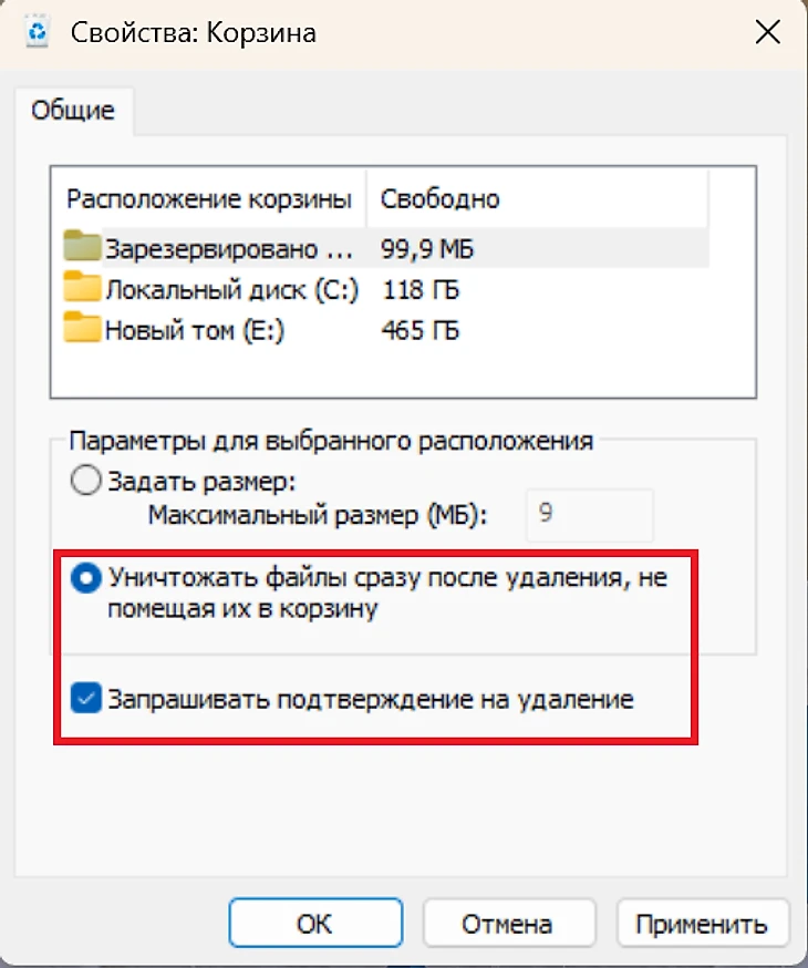 На Рабочем столе кликните правой кнопкой мыши по значку «Корзина». Выберите «Свойства». Выберите «Уничтожать файлы сразу», а для того, чтобы не удалять нужные файлы поставьте галочку «Запрашивать подтверждение на удаление».