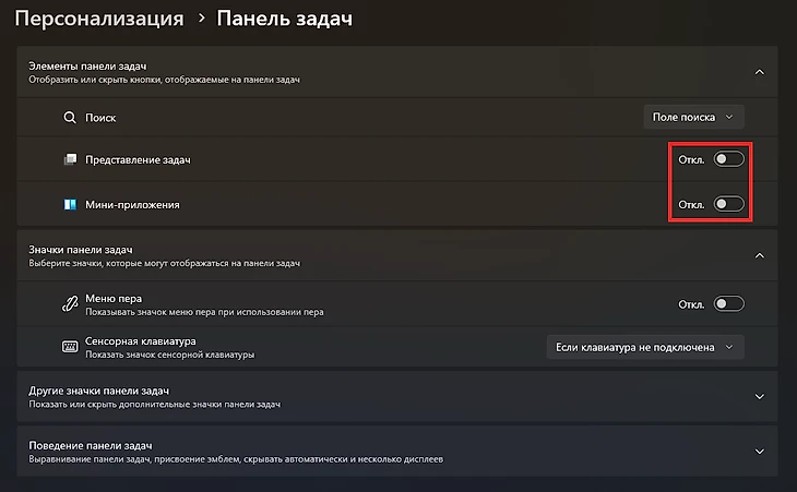 Кликните правой кнопкой мыши по Панели задач. Выберите «Параметры панели задач». Отключите: «Представление задач» и «Мини-приложения».