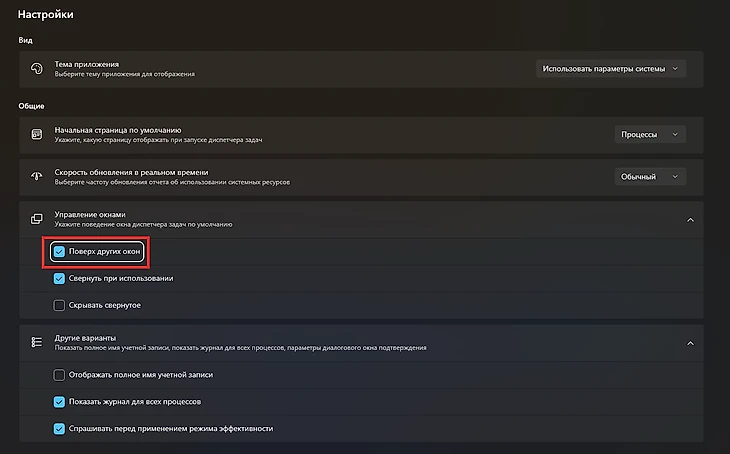Найдите пункт «Поверх других окон» и поставьте галочку.