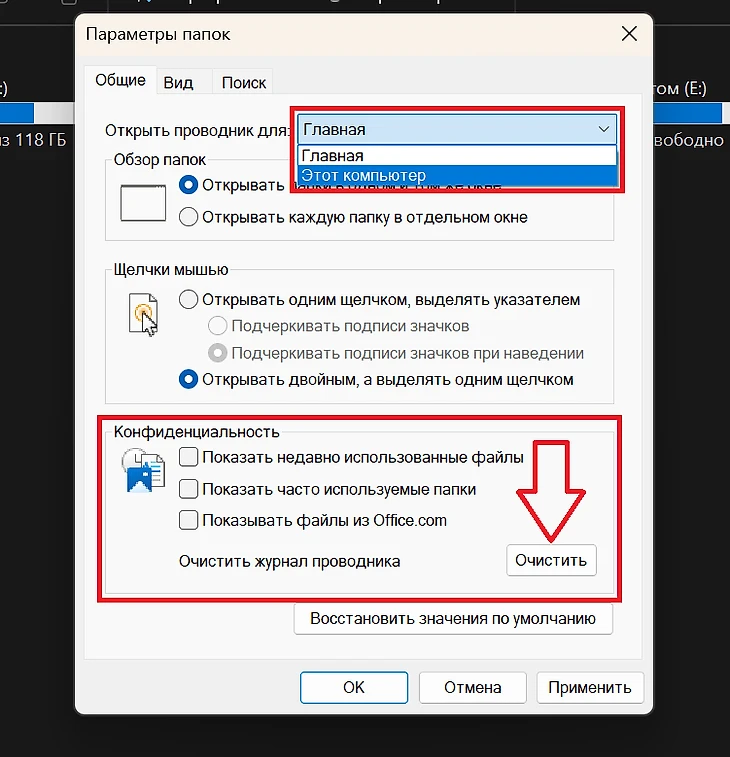 В выпадающем меню «Открыть проводник для:» выберите «Этот компьютер». Снимите все три галочки в разделе «Конфиденциальность»: Нажмите кнопку «Очистить» рядом с «Очистить журнал проводника».