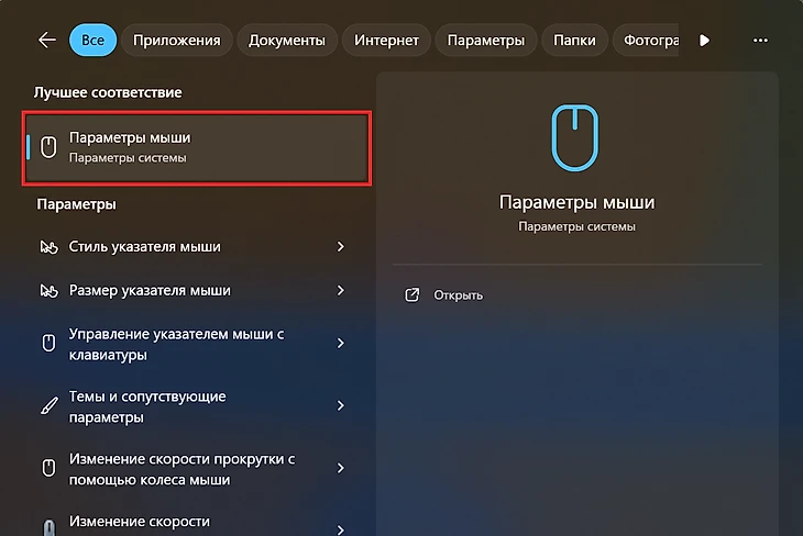 Нажмите на значок Поиска на Панели задач. Введите «Параметры мыши» и откройте найденное приложение.