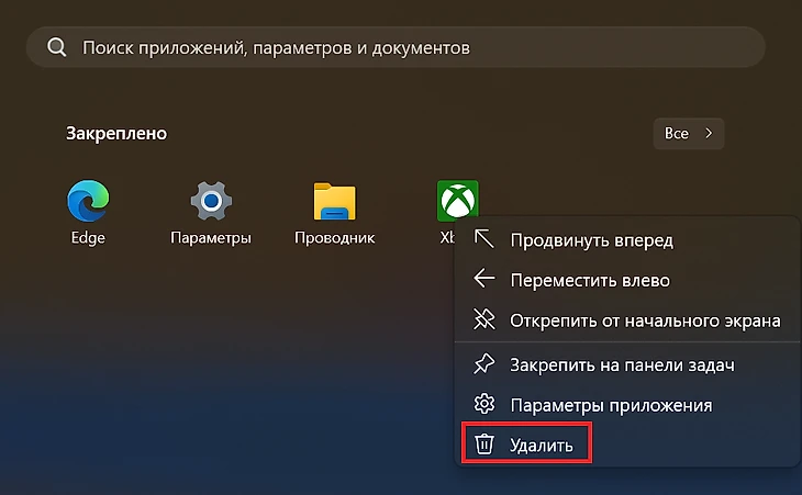 Откройте меню «Пуск». Найдите ненужные вам предустановленные приложения. Кликните по выбранному приложению правой кнопкой мыши и выберите «Удалить».