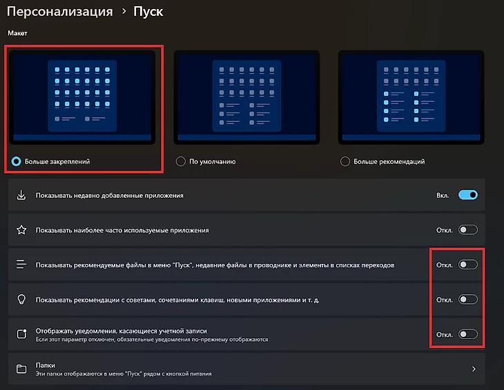 В пункте «Макет» выберите «Больше закреплений». Найдите и выключите пункты: «Показывать рекомендуемые файлы», «Показывать рекомендации с советами», «Отображать уведомления, касающиеся учетной записи».
