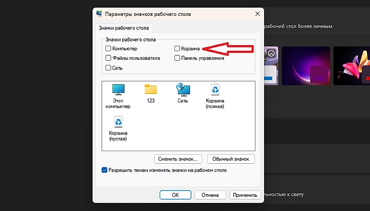 Найдите и нажмите «Параметры значков рабочего стола». В открывшемся окне снимите галочку с пункта «Корзина» – больше она нам не нужна.
