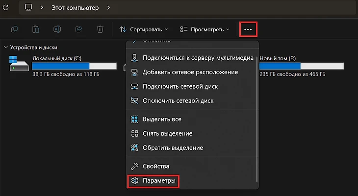 Откройте Проводник. Перейдите в раздел «Этот компьютер». Нажмите на кнопку с тремя точками в верхней строке меню. Выберите «Параметры».