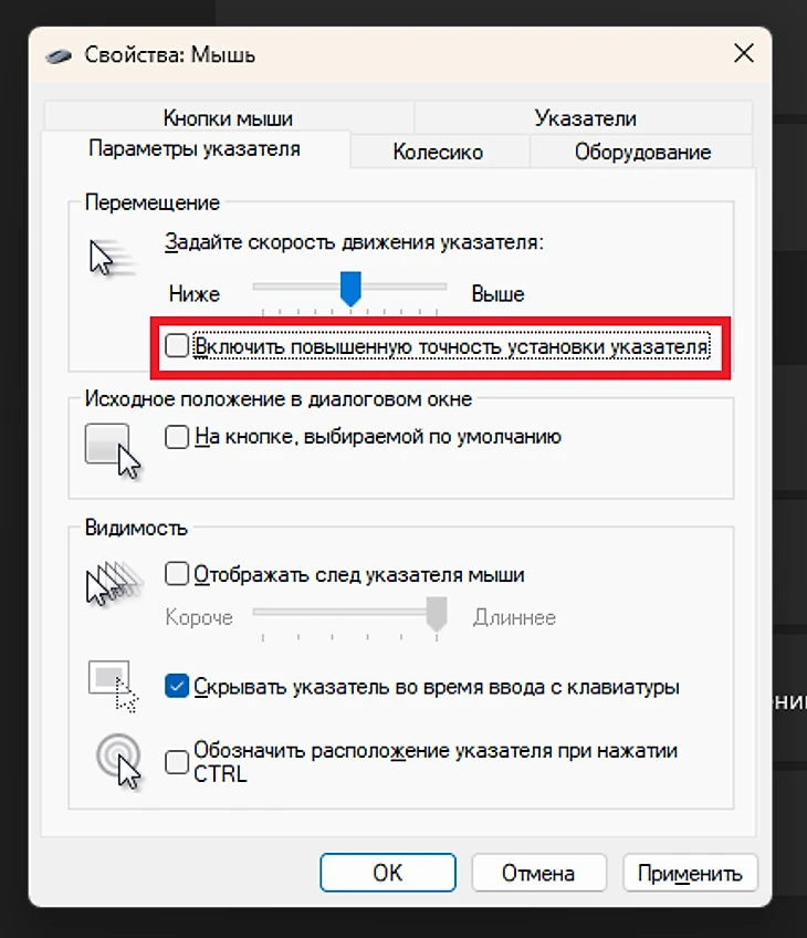 Перейдите на вкладку «Параметры указателя». Снимите галочку с пункта «Включить повышенную точность указателя». Нажмите «Применить», затем «ОК».