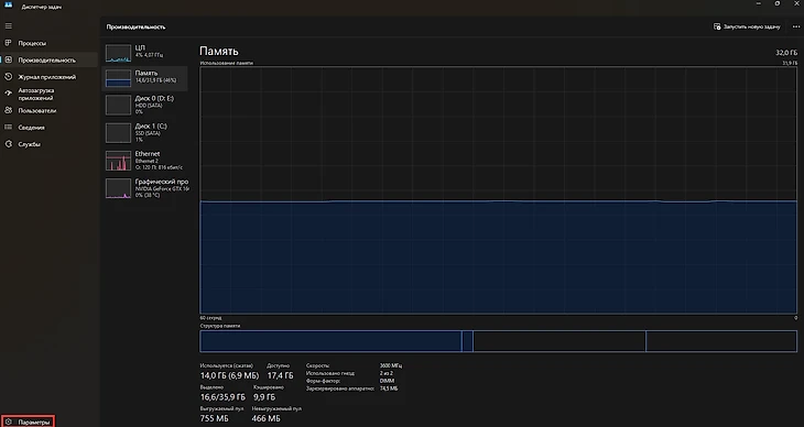 Кликните правой кнопкой мыши по Панели задач. Выберите «Диспетчер задач». Перейдите на вкладку в «Параметры».