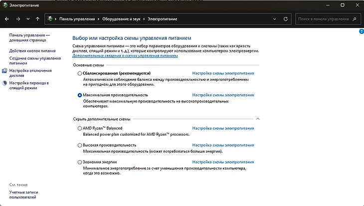 Нажмите на Поиск на Панели задач. Введите «Электропитание» и откройте одноименное приложение. Нажмите «Показать дополнительные схемы».