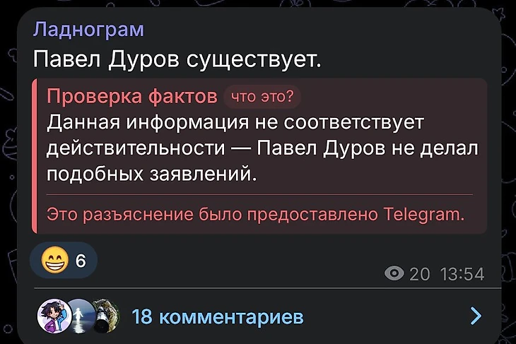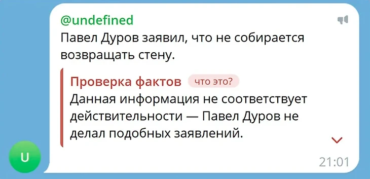Впервые систему фактчекинга заметили под постом канала We TON, который распространил новость о якобы уходе телеграма из России, ссылаясь на сатирическое СМИ.