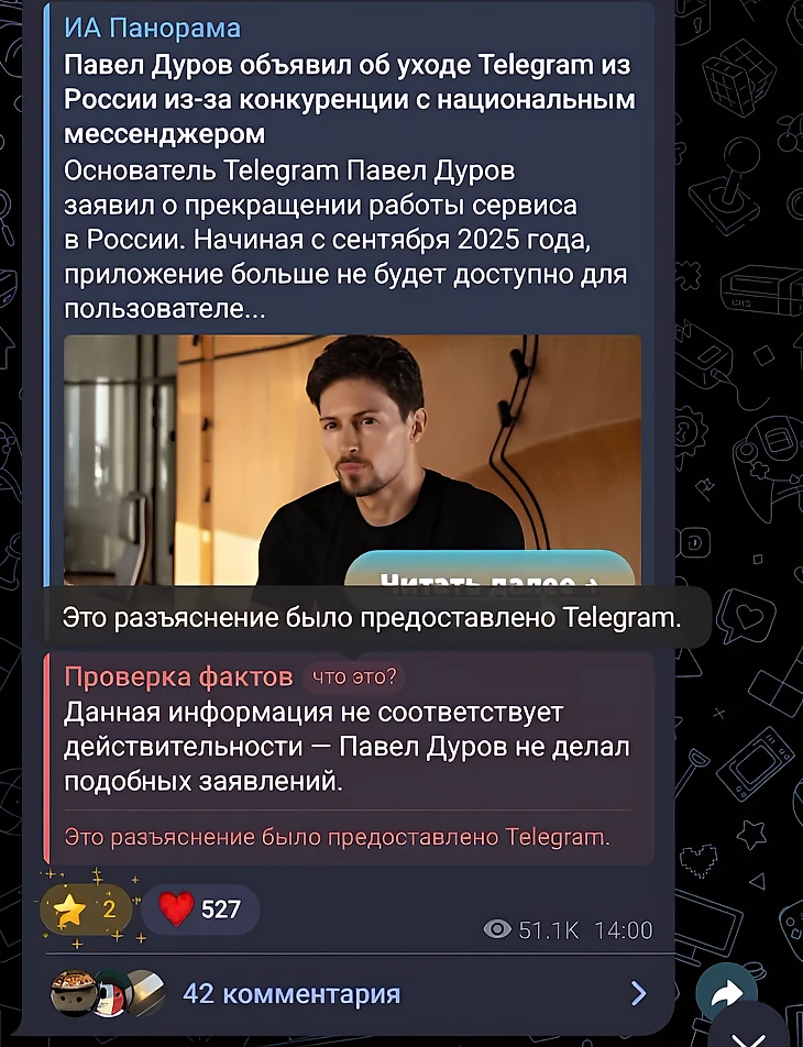 Под постом возникла плашка «Проверка фактов» (Fact Check) с сообщением: «Данная информация не соответствует действительности – Павел Дуров не делал подобных заявлений».