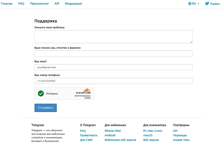 Через приложение: «Настройки», «Помощь», «Задать вопрос» или через веб-форму: https://telegram.org/support