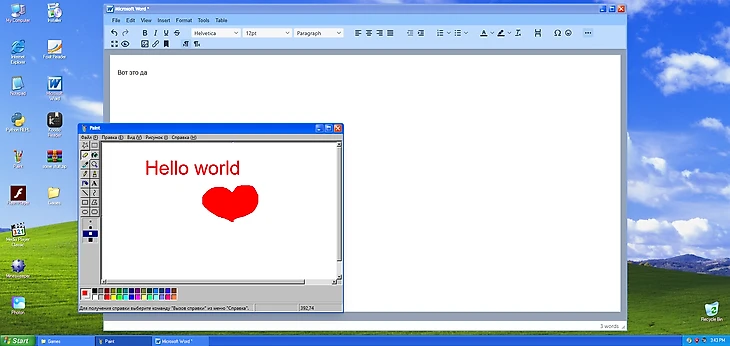 Пользователи могут запустить не только известные игры Windows, такие как «Сапер», «Пасьянс» и 3D Pinball Space Cadet, но и другой софт с рабочего стола. Помимо прочего, здесь «установлены» работающие браузер Internet Explorer, текстовый редактор Microsoft Word и Paint. Последний даже запустился с интерфейсом на русском.