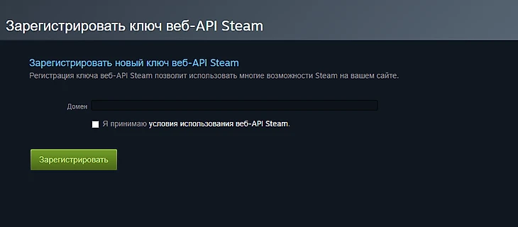 • Если вы видите сообщение «Зарегистрировать новый ключ веб-API Steam», то у вас нет активного API-ключа.